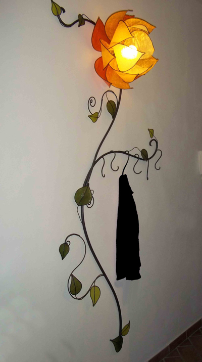 Il fiore di loto nei toni dell’arancione e il ramo con foglie, decorano questo appendiabiti luminoso.